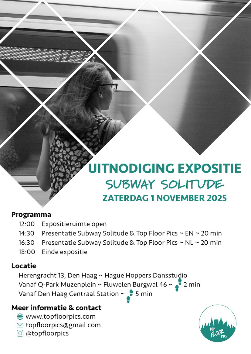 Zwart wit is nooit alleen maar zwart wit. Deze allereerste Top Floor Pics expositie zit vol contrast en ritme. Van de straat. Uit de metro. Van mensen die altijd in beweging zijn. Waar blikken kruisen, ramen weerspiegelen en momenten weer net zo snel verdwijnen als ze verschijnen. Daal met me af in de ondergrondse wereld van de stad met Subway Solitude. Geen ticket nodig.